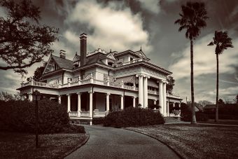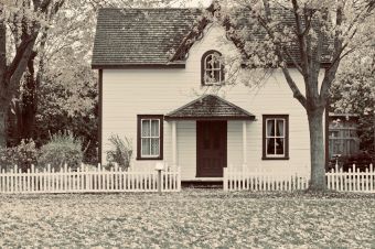 Early 1900s house with a gated porch; tree in front of the home.